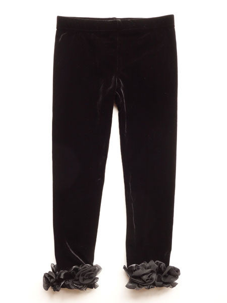 Velvety velour leggings with chiffon rosette trim. Toddler and little girls sizes.