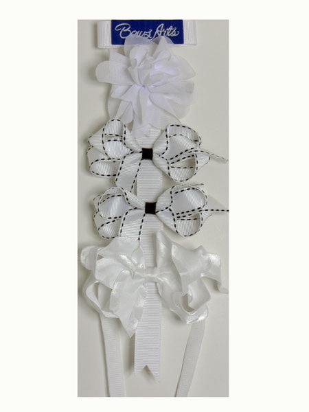 Gift set of four white toddler hair bows on clippies with one stretchy white grosgrain headband. Custom assortment for llbd shop.