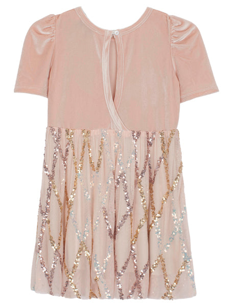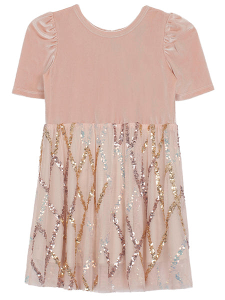 Elegant and festive pink velvet and mesh dress is perfect for every celebration! Beautiful detailing – short-sleeve, velvet top with fine topstitching, multicolored sequin mesh skirt and tailored long keyhole opening on the back.