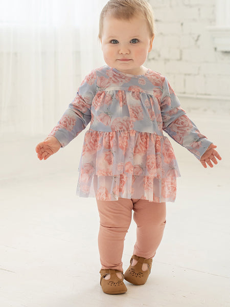 Pretty rose pattern floral top and leggings in dusty rose and gray. Leggings have subtle metallic flecks.