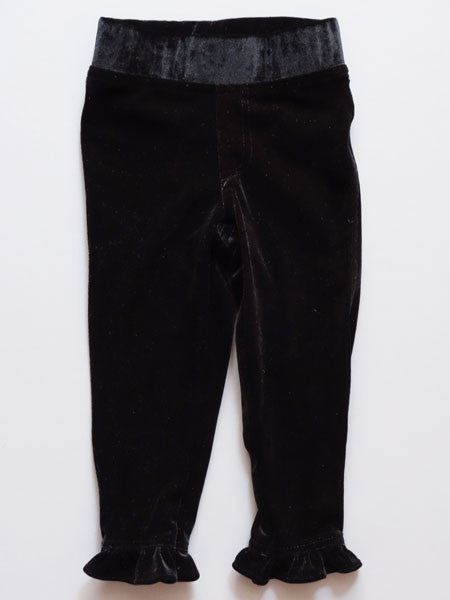 - Black velvet leggings, ruffled edges.