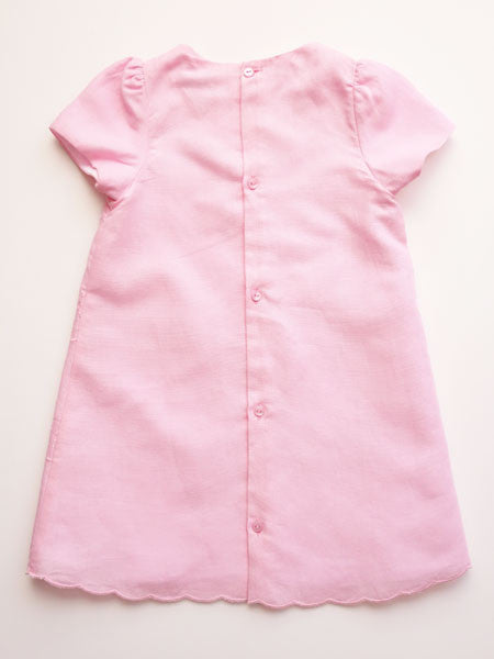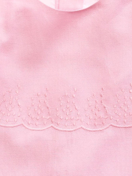 Precious pink linen dress from Luli & Me for Spring. Scalloped pattern embroidery. Baby and toddler girl sizes.