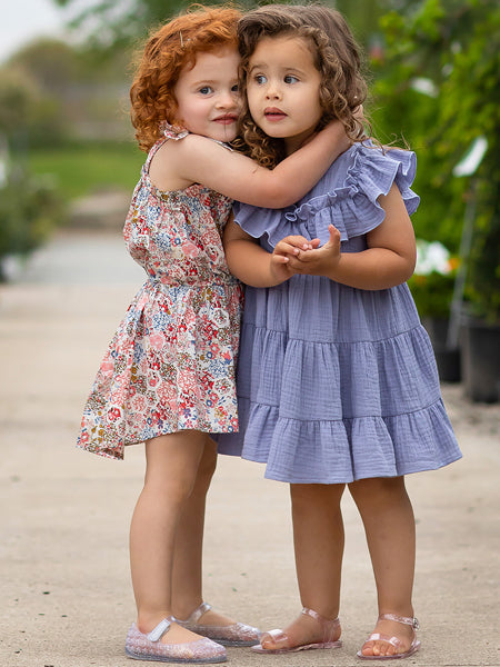 A delightful tiered dress for girls, by Mabel + Honey. Made from a pure cotton gauze fabric, featuring a ruffled neck detail and a keyhole opening in the back. It's light and soft so it's comfortable for play, but it is also chic enough for parties.