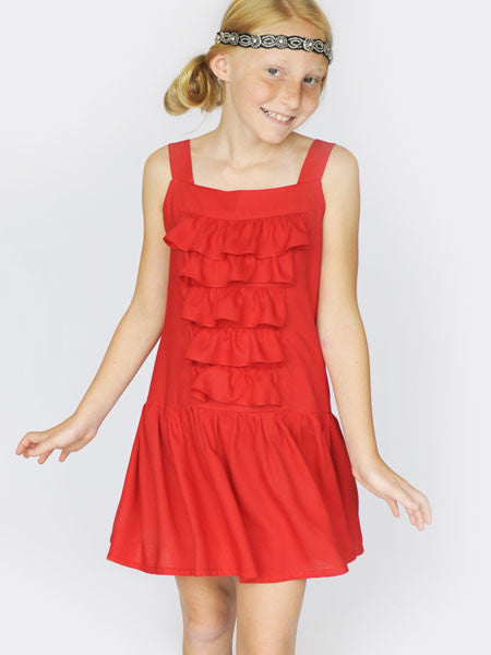 Ruffle drop waist dress by Maria Casero, stand out pop of color for any occasion, casual to party. Girls sizes.